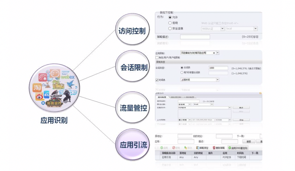 ●灵活应用控制。基于深度应用识别及精细化的应用筛选,巅峰国际数码下一代防火墙支持灵活的安全控制功能。包括策略阻止、会话限制、流量管控、应用引流或时间限制等。
