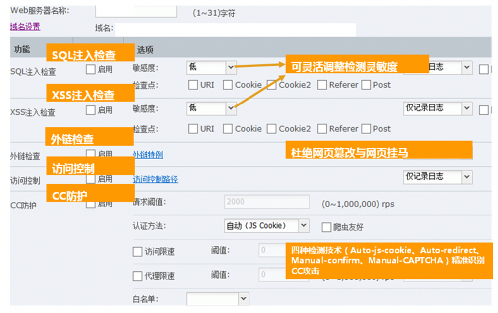 ● 支持缓冲区溢出、SQL 注入和跨站脚本、外链、Web访问攻击的检测和防护