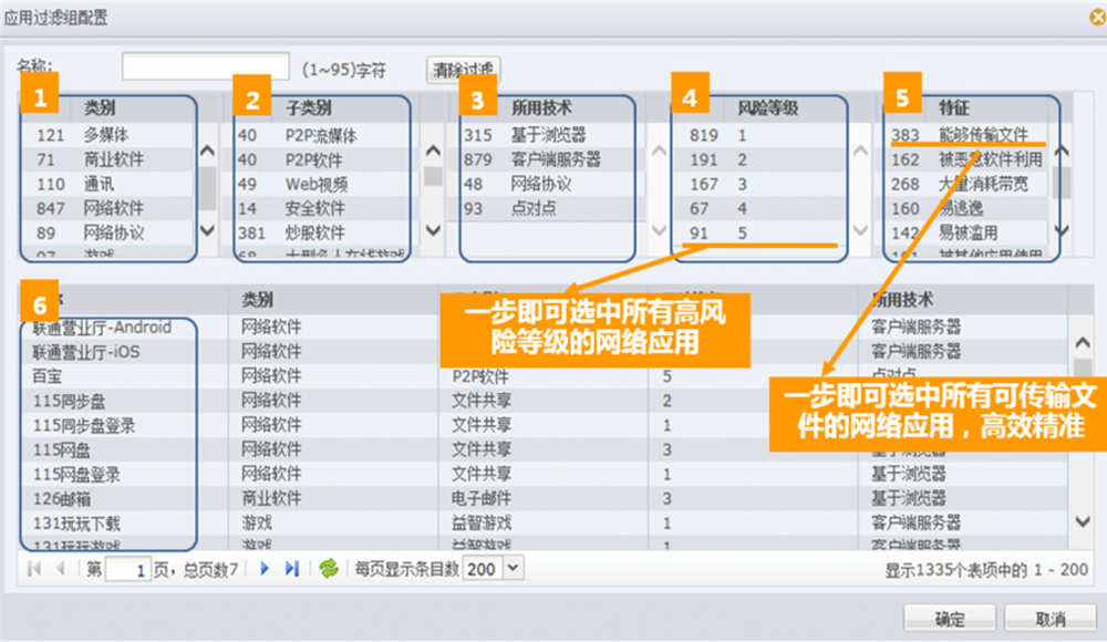 ●精准应用筛选。巅峰国际数码下一代防火墙给予了精细化的应用筛选机制。用户可根据应用名称、应用类别、应用子类别、风险级别、所用技术、应用特征等6大条件。精确筛选出感兴趣的应用类型,如具备文件传输功能的通讯软件,或存在已知漏洞、基于浏览器的WEB视频应用等等,从而实现精细化的应用管控。